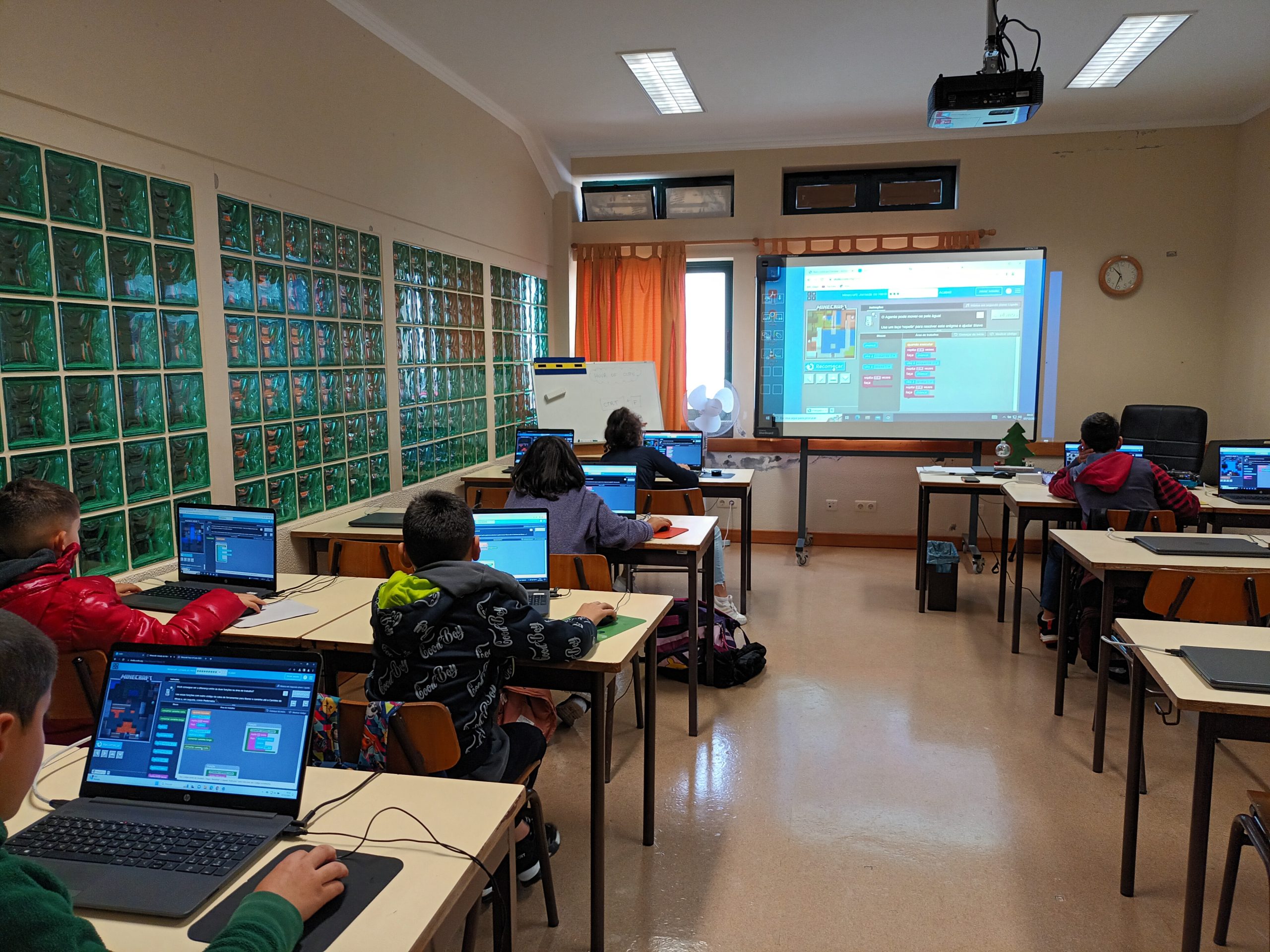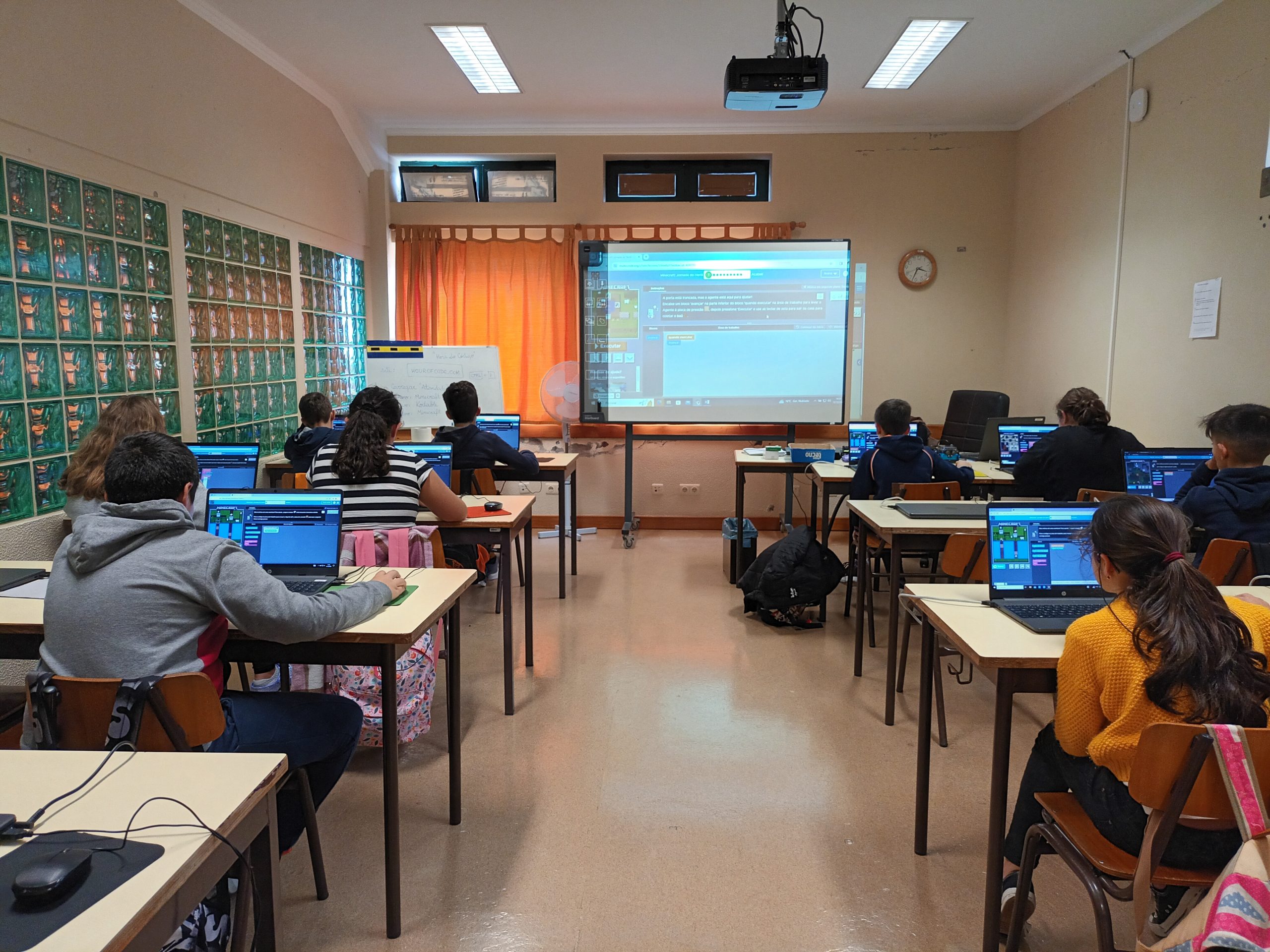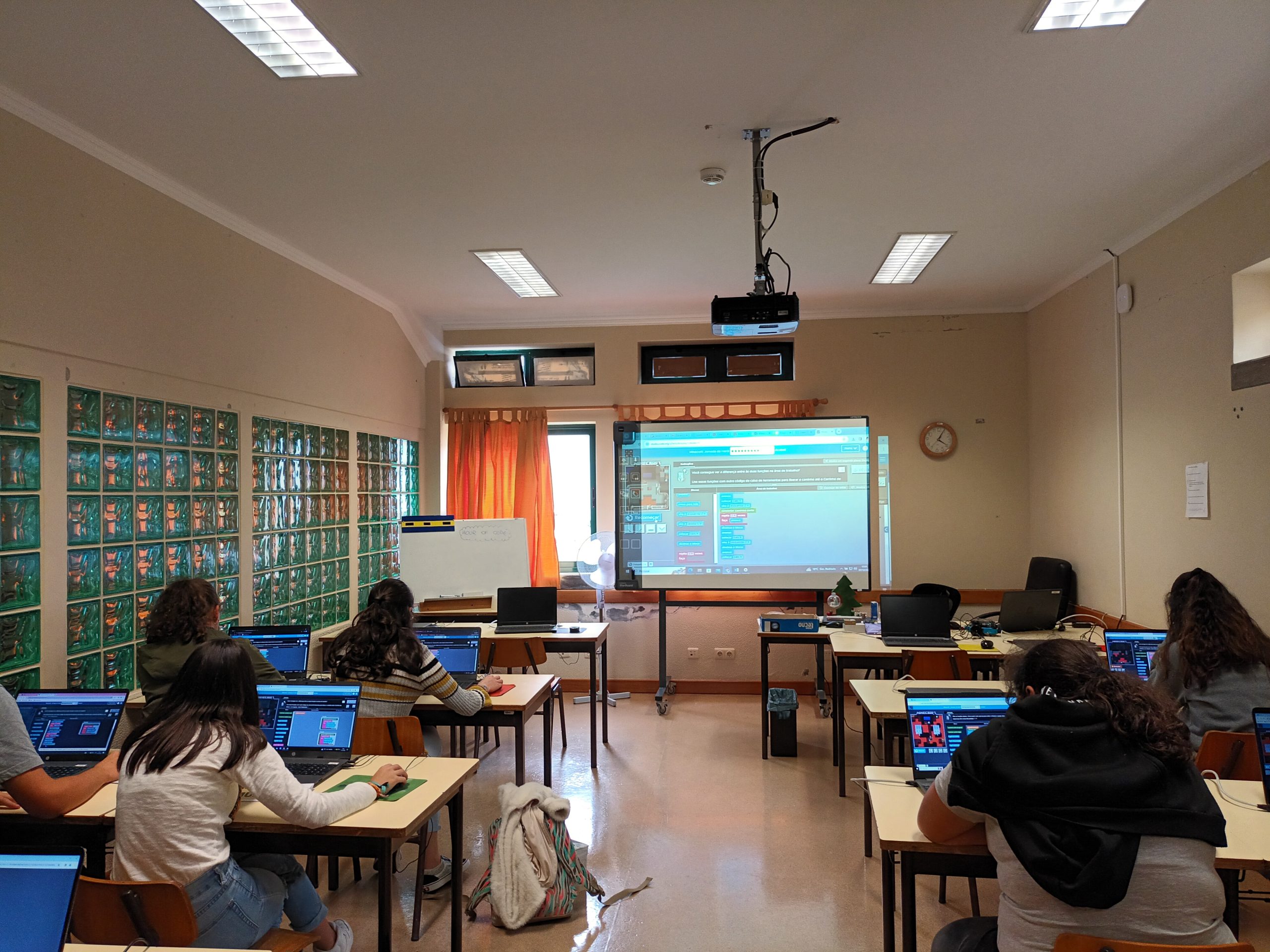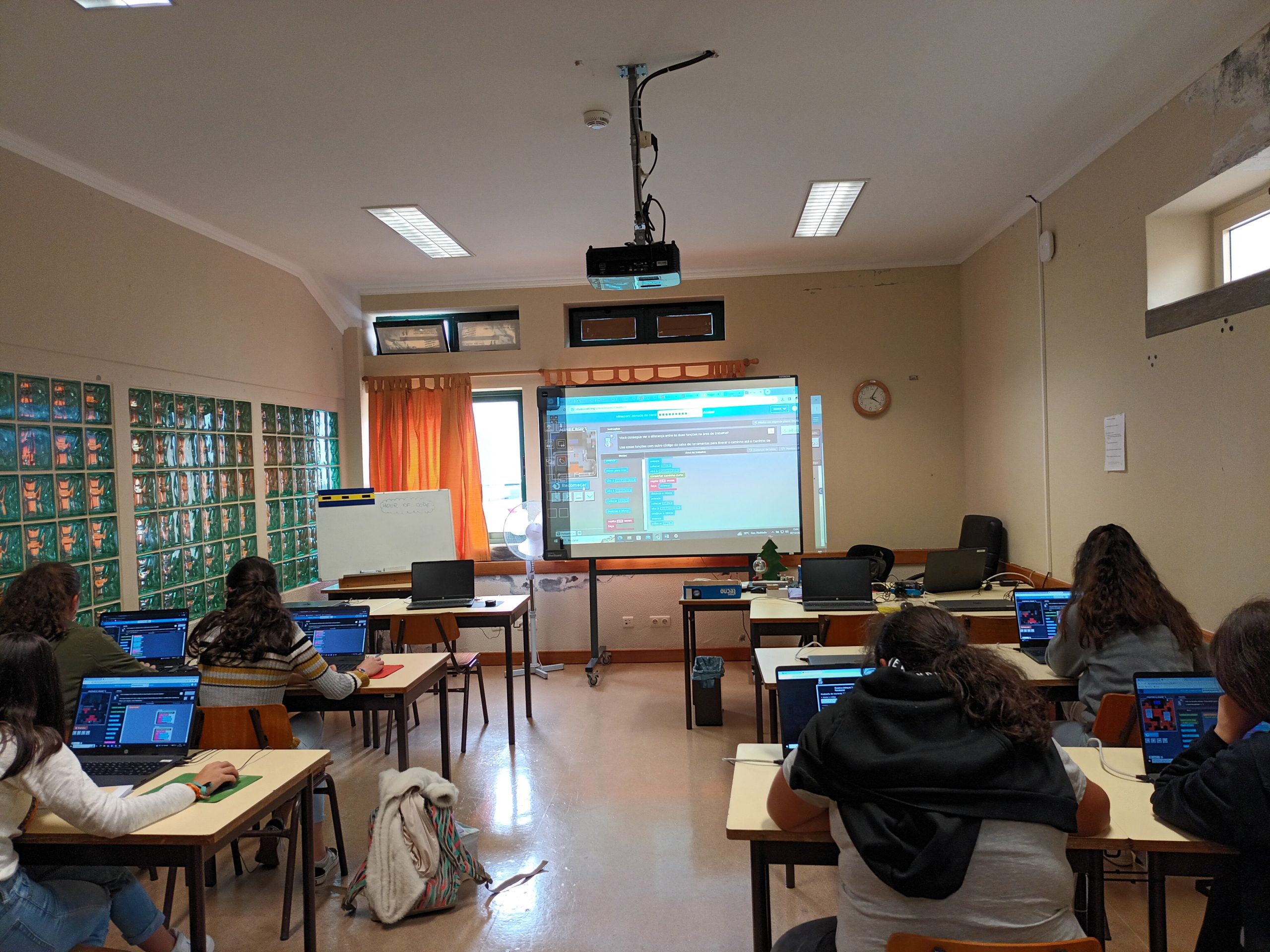 Do dia seis a quatorze de dezembro, os alunos da pré-escolar ao nono ano participaram da atividade “Hora do Código” (https://hourofcode.com/pt/pt), através dos jogos “Kodable” (https://www.kodable.com/), “Minecraft” (https://studio.code.org/s/hero/) e “Compute IT” (https://compute-it.toxicode.fr/?hour-of-code&progression=python), disponível na plataforma interativa Code.Org (https://code.org/), na qual tiveram a oportunidade de aprender a programar (codificar) em blocos. Esta atividade foi dinamizada pela docente da disciplina de Tecnologias da Informação e Comunicação (TIC).