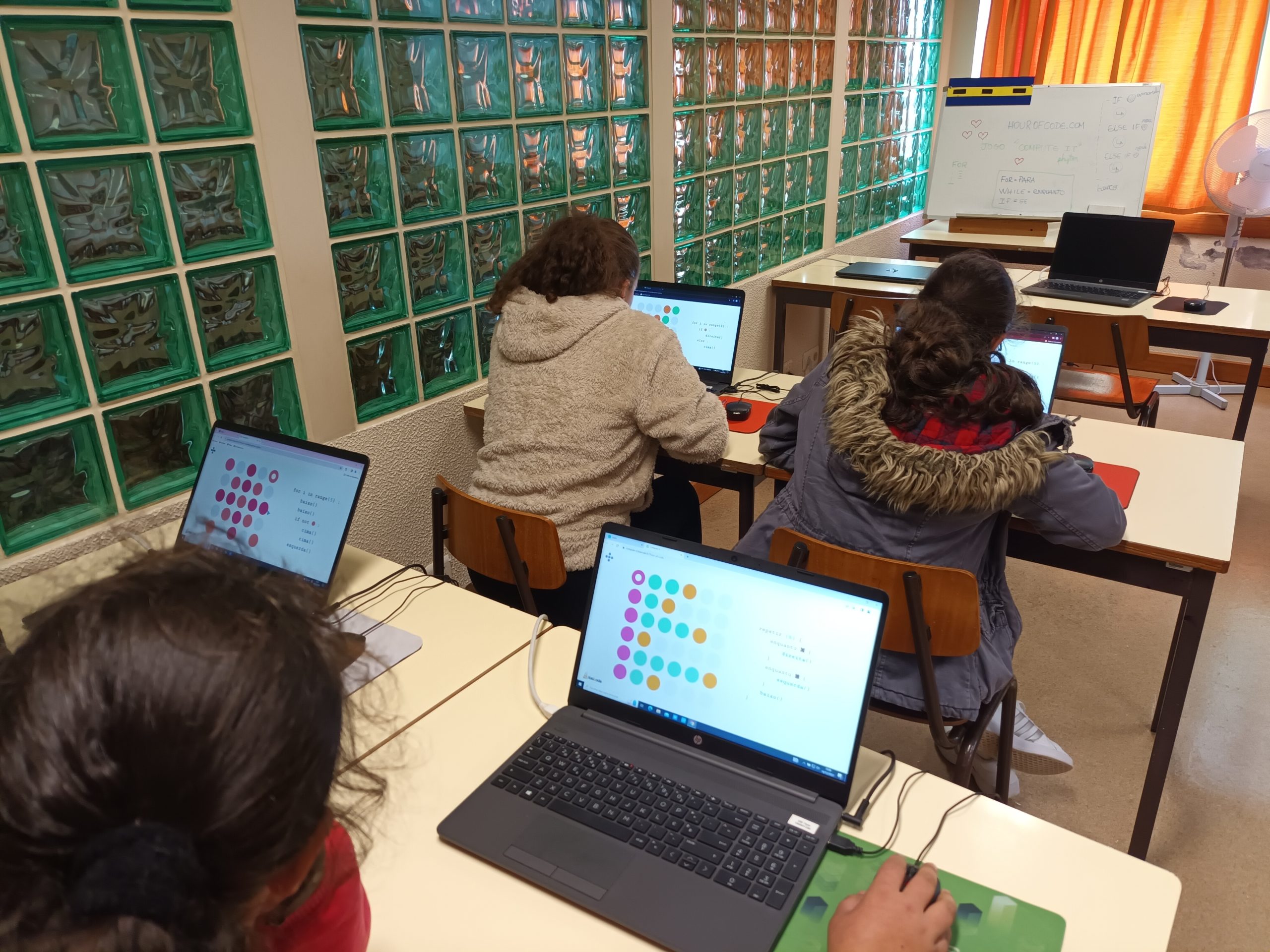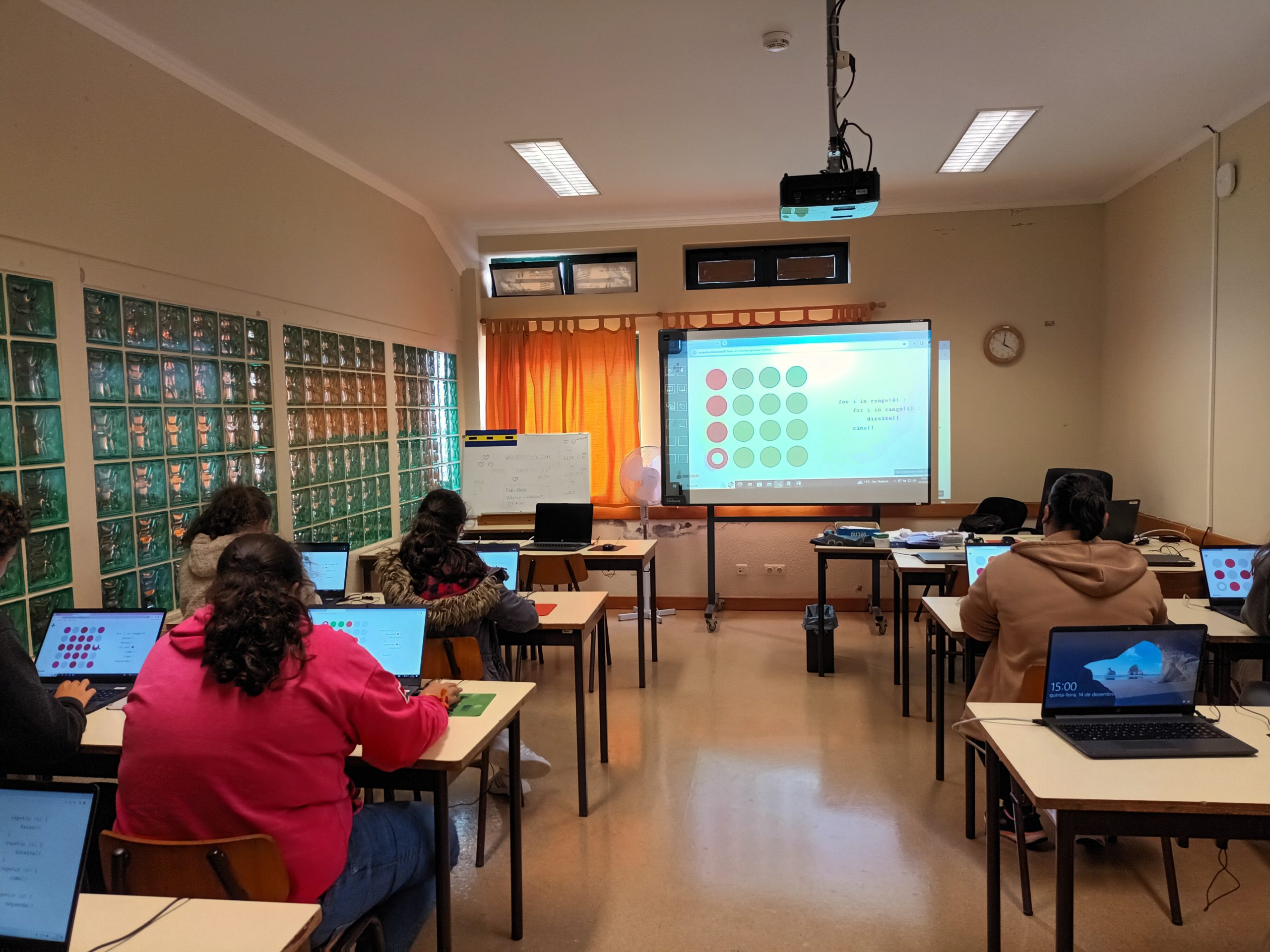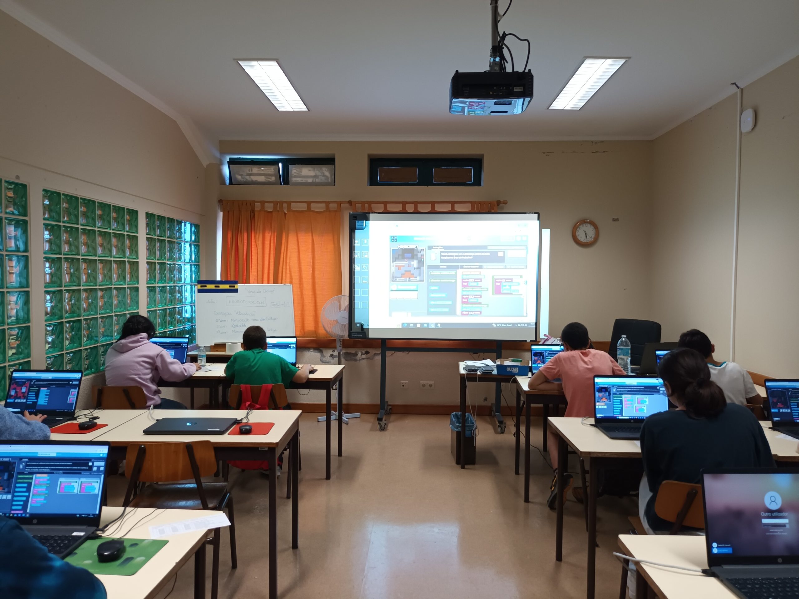 Do dia seis a quatorze de dezembro, os alunos da pré-escolar ao nono ano participaram da atividade “Hora do Código” (https://hourofcode.com/pt/pt), através dos jogos “Kodable” (https://www.kodable.com/), “Minecraft” (https://studio.code.org/s/hero/) e “Compute IT” (https://compute-it.toxicode.fr/?hour-of-code&progression=python), disponível na plataforma interativa Code.Org (https://code.org/), na qual tiveram a oportunidade de aprender a programar (codificar) em blocos. Esta atividade foi dinamizada pela docente da disciplina de Tecnologias da Informação e Comunicação (TIC).